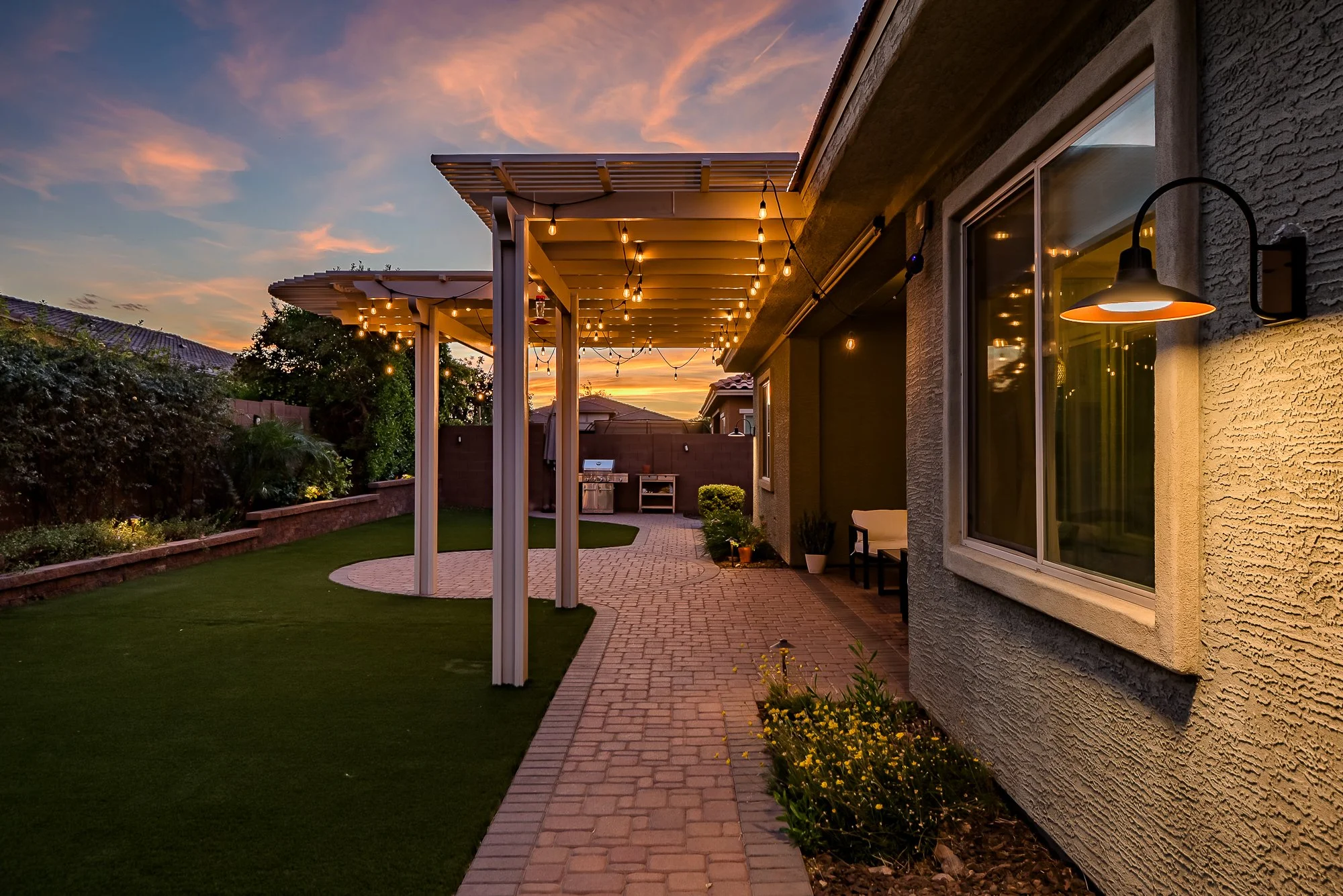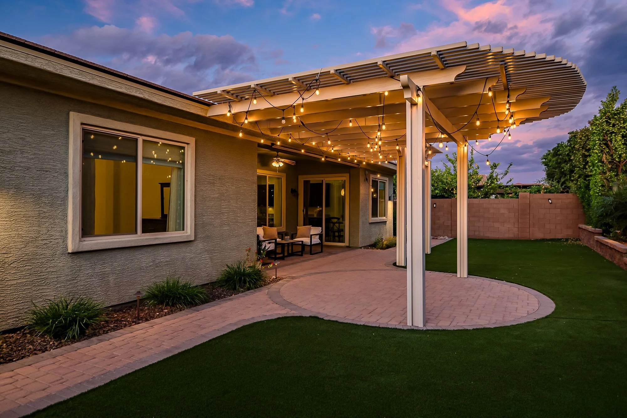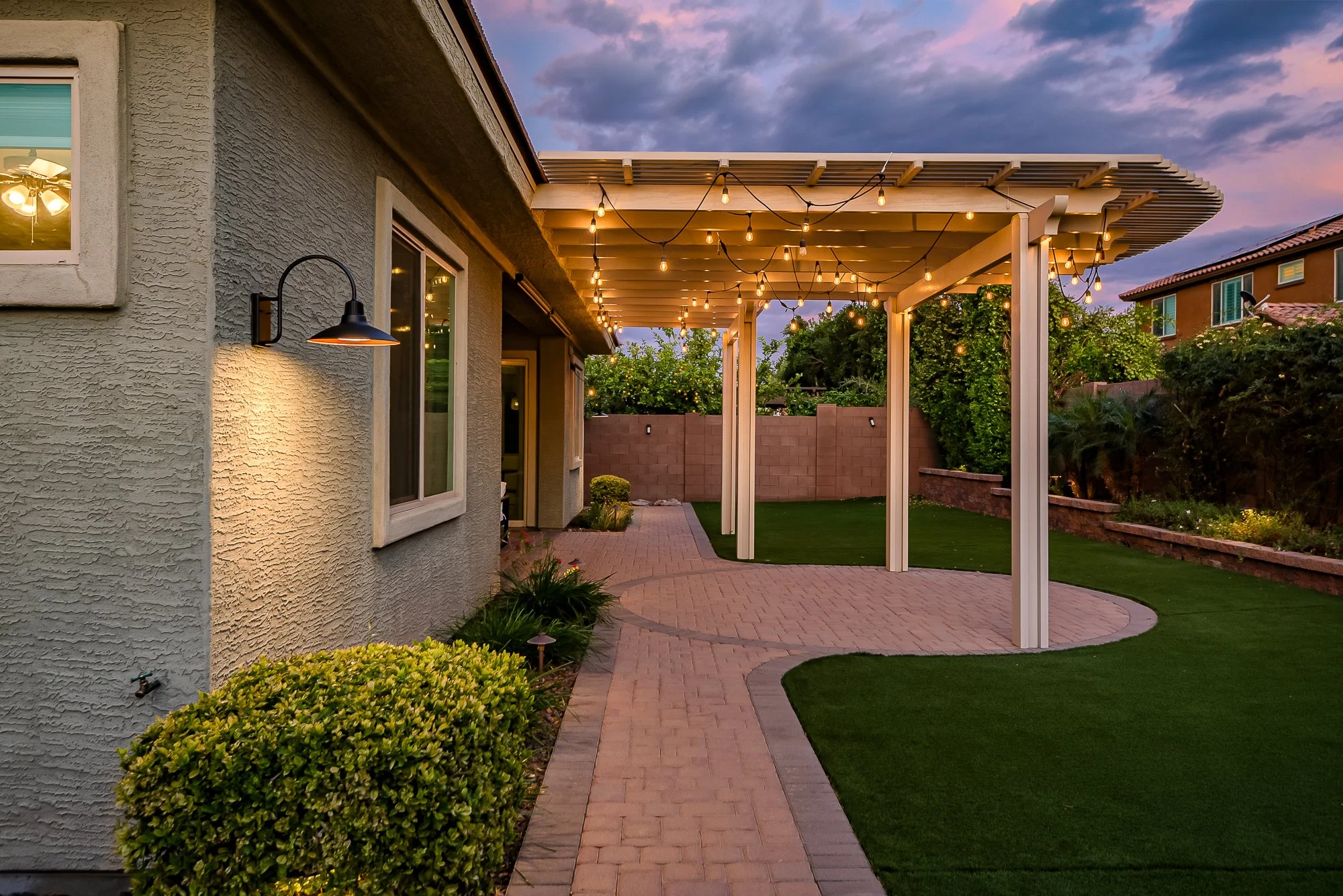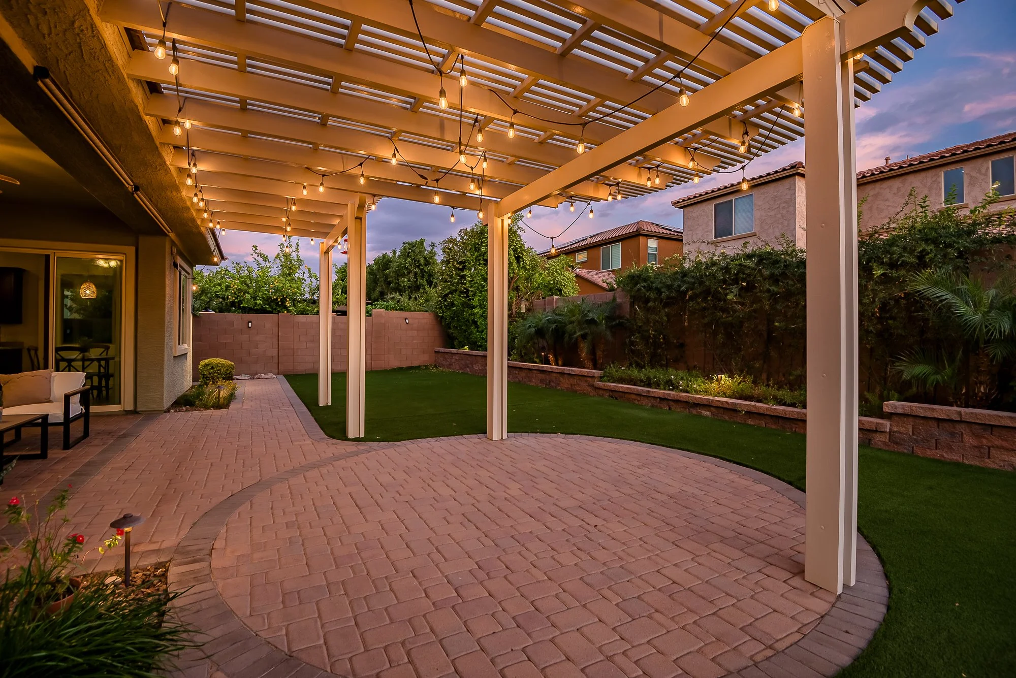 The backyard creates a peaceful space to enjoy Arizona living, complete with a custom pergola with string lighting, lush low-maintenance turf, paver patios and walkways, raised garden beds, and mature landscaping.