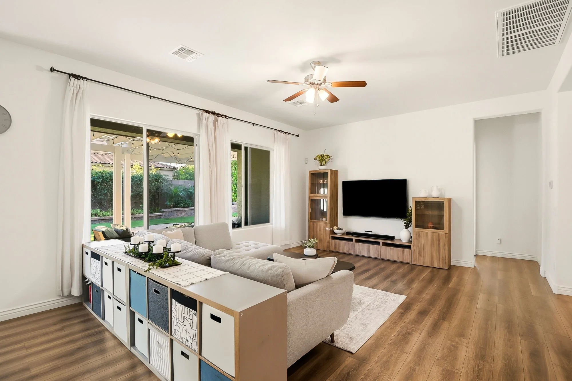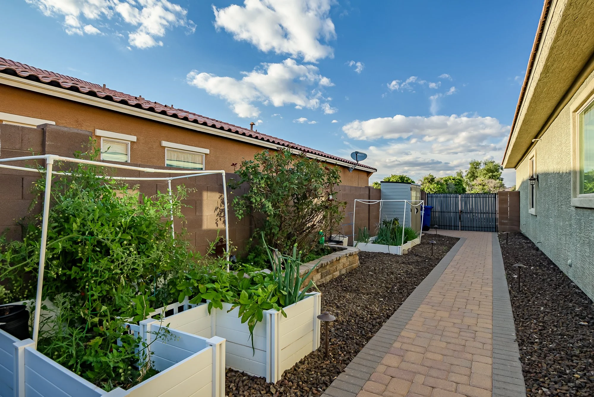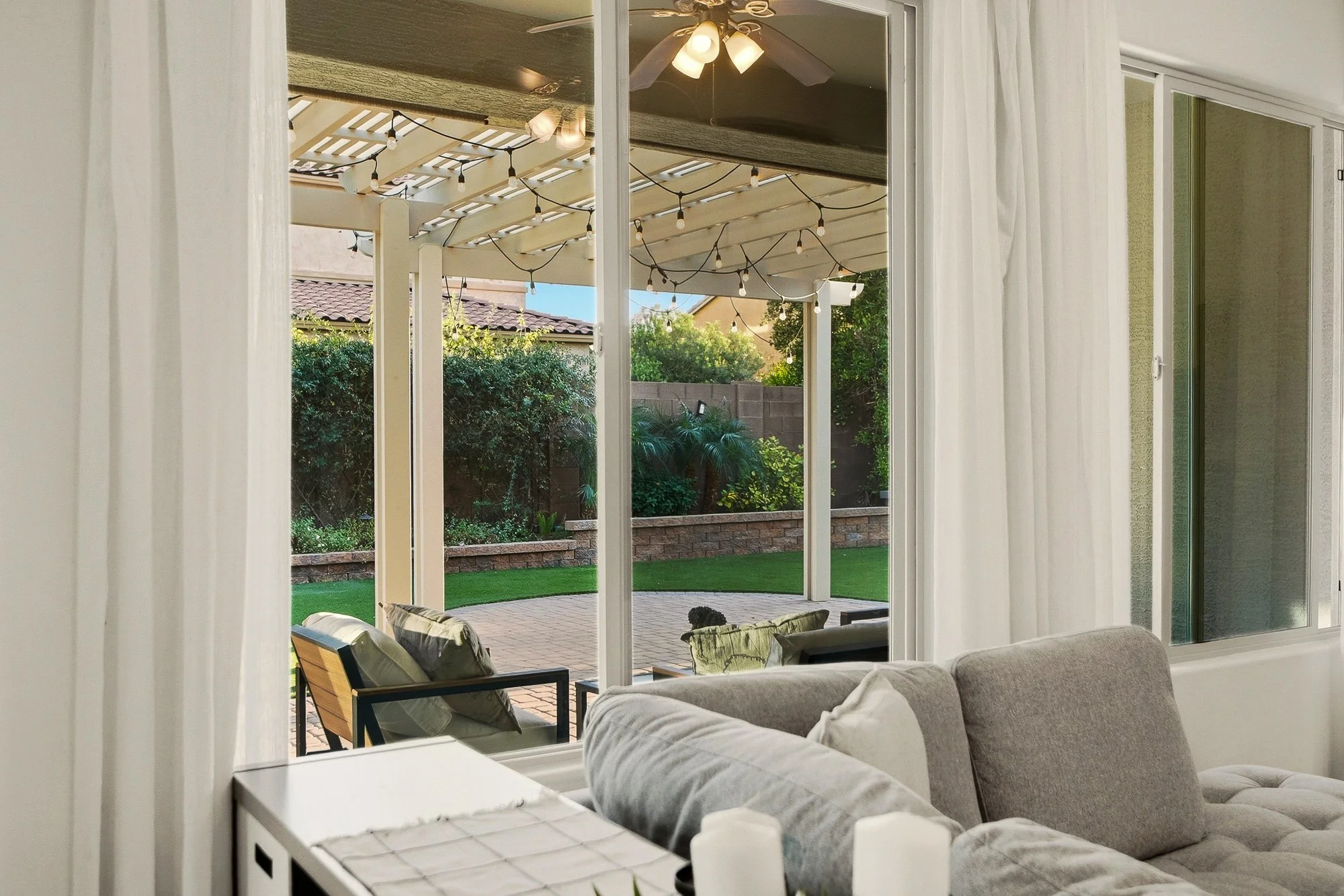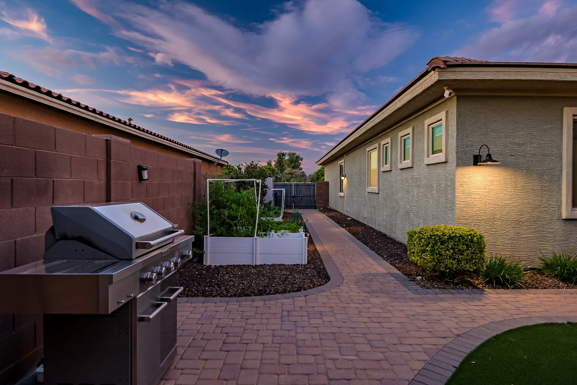 The backyard creates a peaceful space to enjoy Arizona living, complete with a custom pergola with string lighting, lush low-maintenance turf, paver patios and walkways, raised garden beds, and mature landscaping.